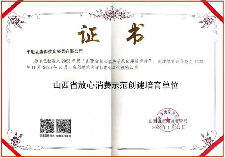 平遙煤化集團唐都推光漆器公司作為平遙縣推光漆器的代表,始終秉承傳統(tǒng)工藝與現(xiàn)代理念相結合的發(fā)展理念,堅持為消費者提供高品質(zhì)的產(chǎn)品和高質(zhì)量的服務。此次榮獲“山西省放心消費示范創(chuàng)建培育單位”榮譽稱號,不僅是上級管理部門對唐都公司長期以來堅持“誠信經(jīng)營、質(zhì)量至上”服務理念的充分認可,更是對企業(yè)持續(xù)推動消費環(huán)境改善,保護消費者權益等工作的高度肯定。